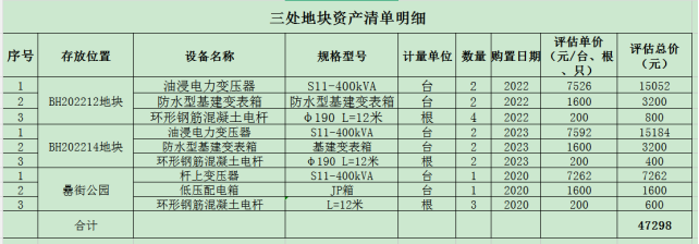 | 本次转让标的为合肥滨湖投资控股集团有限公司负责建设的BH202212地块项目、BH202214地块项目以及罍街公园项目基建变项目完工后的残留临时用电设备,临时用电设备含变压器、基建变表箱、电缆等(详见资产清单明细)。BH202212地块位于合肥市包河区休宁路与宿松路交口东南侧,BH202214地块位于包河区徽州大道与望江路交口东南角。 本次转让的标的资产均已报废,无使用价值。委托方不提供任何质量方面的担保或保证。受让方在处置过程中,产生的质量、安全和环保等问题,委托方不承担任何责任,由此产生的一切责任及后果由受让方承担。 上述资产转让已经上级主管单位批准同意处置,安徽安和房地产土地评估有限公司出具了《资产评估报告》,本次拟转让资产总评估价值为47298元,资产评估结果已经有权部门备案。 |