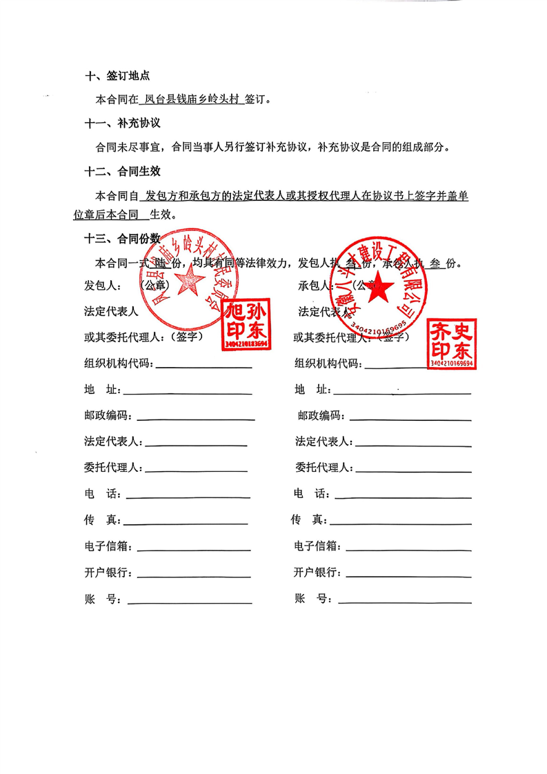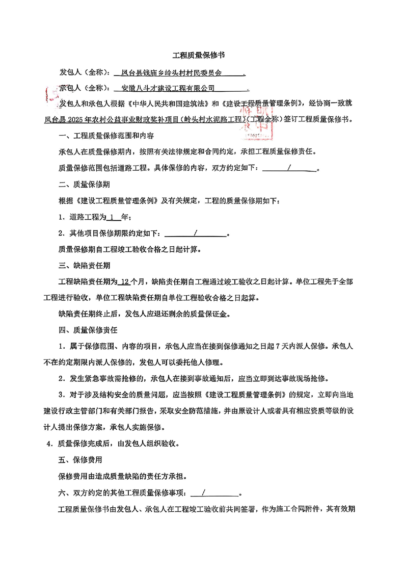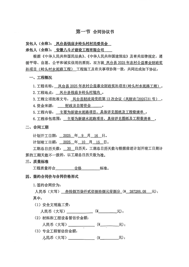 凤台县2025年农村公益事业财政奖补项目(岭头村水泥路工程)合同公示