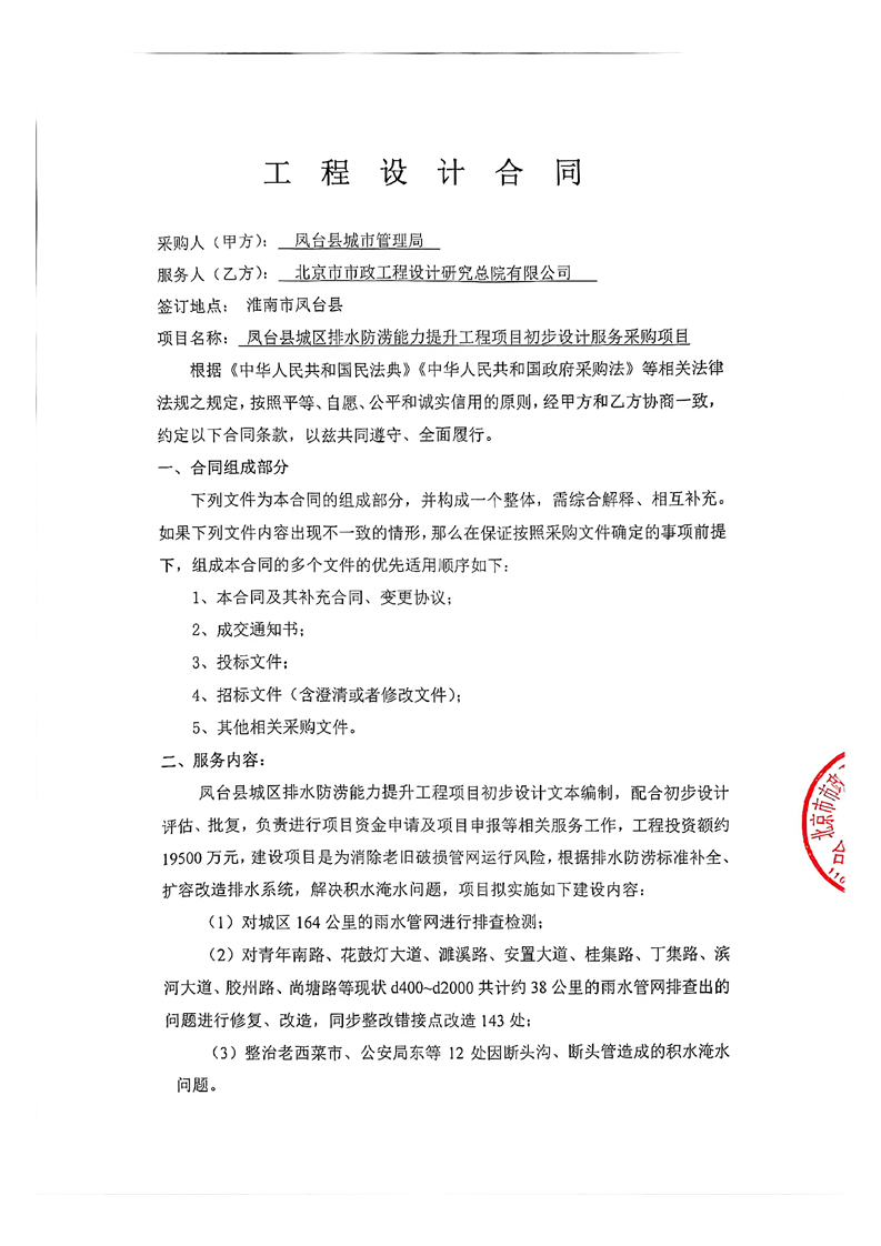 凤台县城区排水防涝能力提升工程项目初步设计服务采购项目合同公示