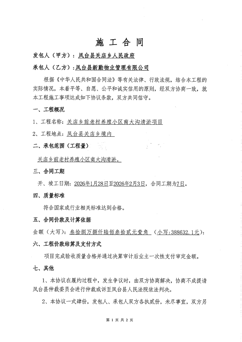 关店乡前老村养殖小区南大沟清淤项目合同公示